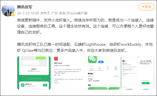3月22日,腾讯张军发文表示:微信更新插件,支持小龙虾接入。微信当年所努力的,就是成为一个连接人、连接设备、连接服务的工具。这个理念依然有效。这个连接,可以方便每个人更好地管理自己的龙虾。