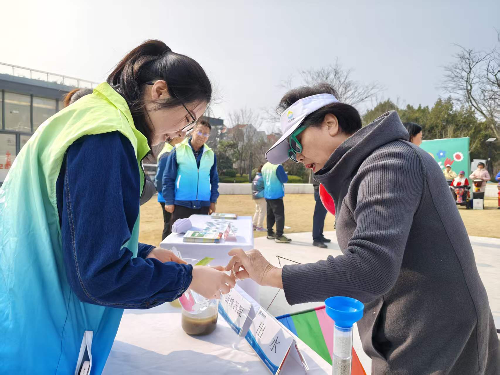走出去,在团岛山公园开启环保宣讲服务。各单位党员志愿者搭设咨询台,为居民送上多形式科普体验。青岛市生态环境局市南分局的工作人员紧扣“中国水周”核心要义,不仅将环保政策化作通俗易懂的“家常话”,更聚焦群众关切的民生热点问题,开展“一对一”靶向答疑,精准回应百姓关切。青岛水务集团环境能源有限公司聚焦污水处理、中水回用、污泥资源化利用三个业务板块,组织青岛市团岛污水处理厂、青岛海湾中水有限公司、青岛娄山河水务资源有限公司同步开展特色科普,全方位展示水务环保全流程。团岛污水处理厂开设“清水小课堂”,通过简易装置演示污水处理过程;海湾中水有限公司讲解再生水在城市道路清洒、绿化灌溉等方面的实际应用价值;娄山河水务资源有限公司发放营养土,让资源循环理念落地实践。