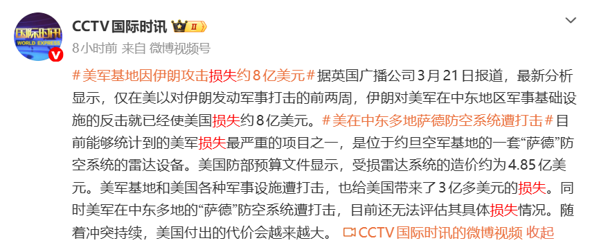 据CCTV国际时讯消息,英国广播公司3月21日报道,最新分析显示,仅在美以对伊朗发动军事打击的前两周,伊朗对美军在中东地区军事基础设施的反击就已经使美国损失约8亿美元。