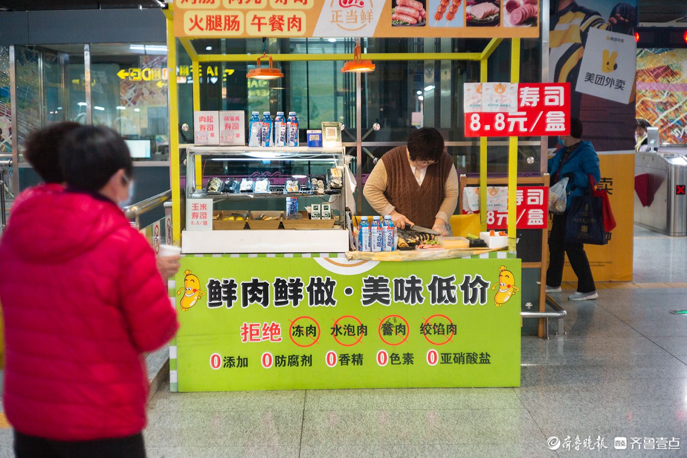 3月21日,济南王府庄地铁内,摊主现场制作寿司,很受乘客欢迎。