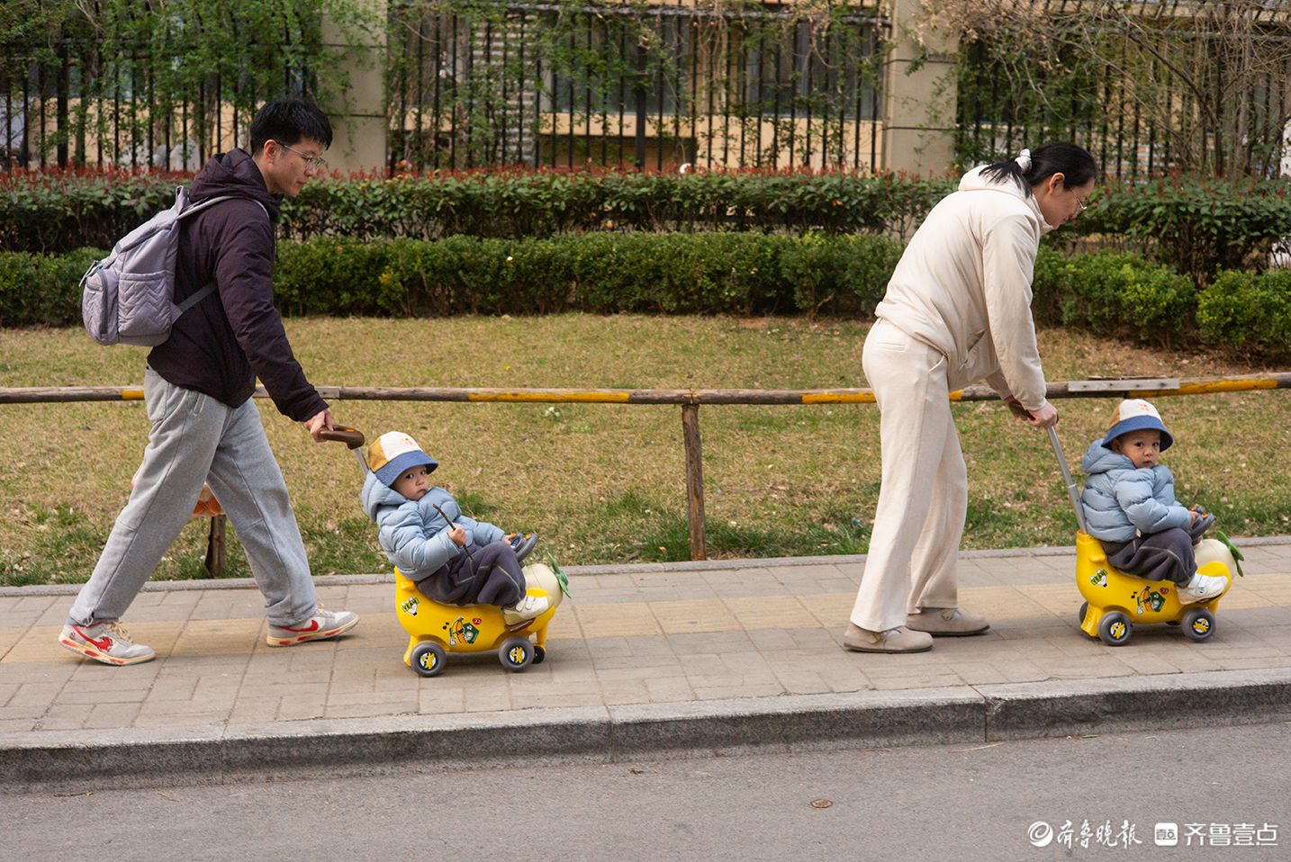 3月19日,济南吉康街,夫妻俩分别推着同款黄色卡通学步车,载着双胞胎孩子并肩行走在春日的回家路上。王剑摄