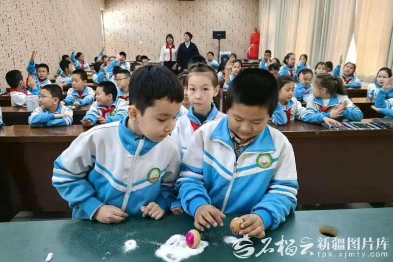 阿勒泰市中心小学学生在体验竖鸡蛋习俗。阿勒泰地区文博院供图