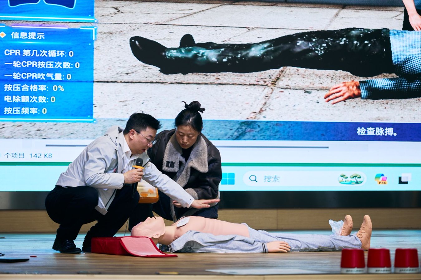 实操演练环节更是本次培训的重点,活动设置气道开放与通气技术、ACLS团队分工与情景配合、CPR+AED标准化操作三大实操站,针对医务工作者、社区工作者及志愿者不同群体开展精准化培训。带教老师采取“一对一指导、分组演练、现场纠错”的方式,手把手教学急救实操技能,同时演示了基于虚拟仿真场景的应急科普平台,让参训人员沉浸式掌握急救关键要领,切实提升实操能力。