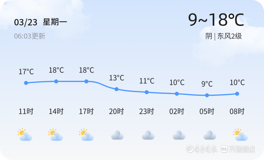 今天是3月23日,星期一,农历二月初五。济宁市今日天气以阴为主,气温在9℃至18℃之间,东风2级,湿度70%,PM2.5指数为137。全市各区的天气情况大致相同,均为阴天,风力较小,温度适中。市民朋友们外出时,建议携带雨具,以备不时之需。