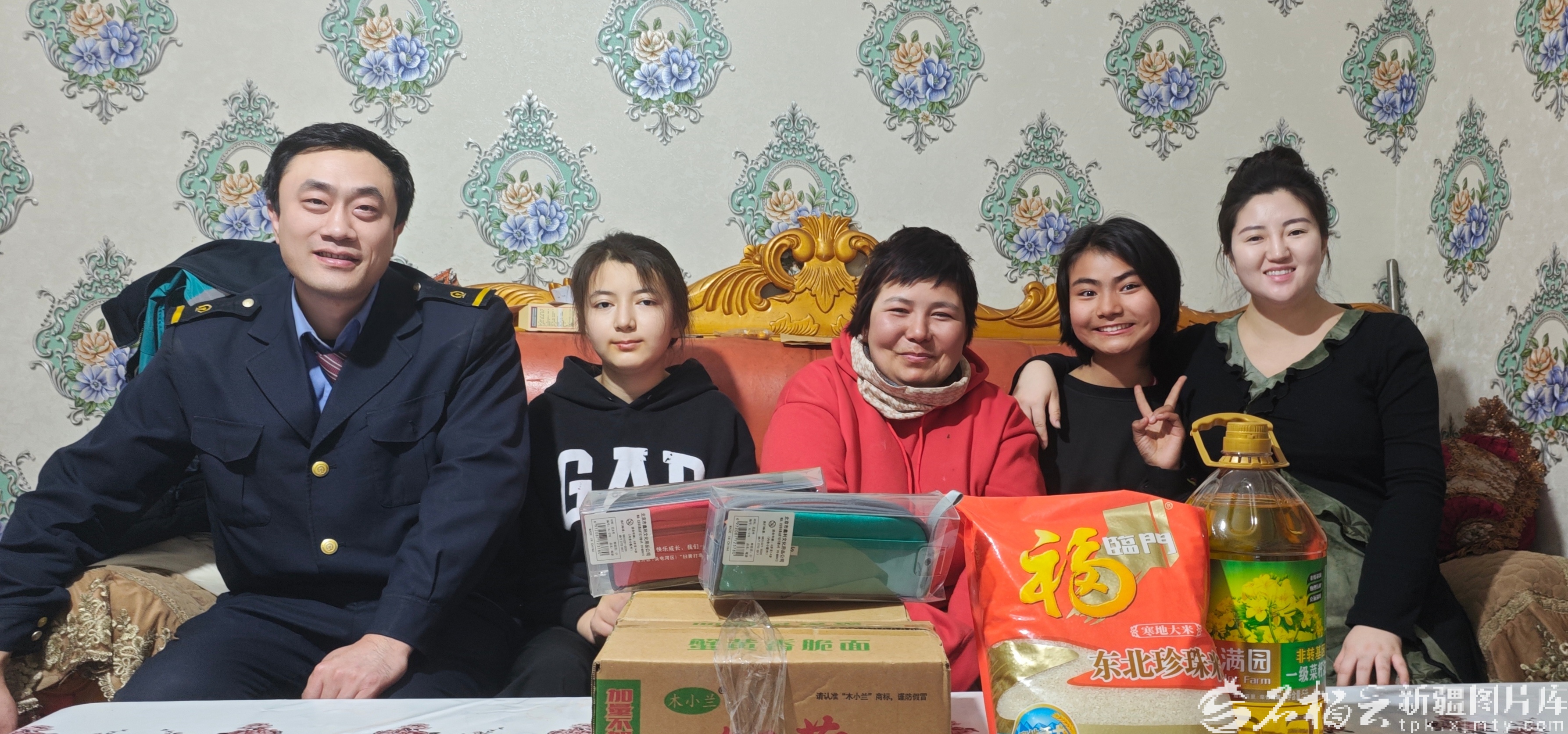 3月19日,毛晓彤(右一)夫妇下班后来到阿尔孜古丽·色买提(右三)家中看望孩子们并送上过节礼品。天山网-新疆日报记者 魏红萍摄