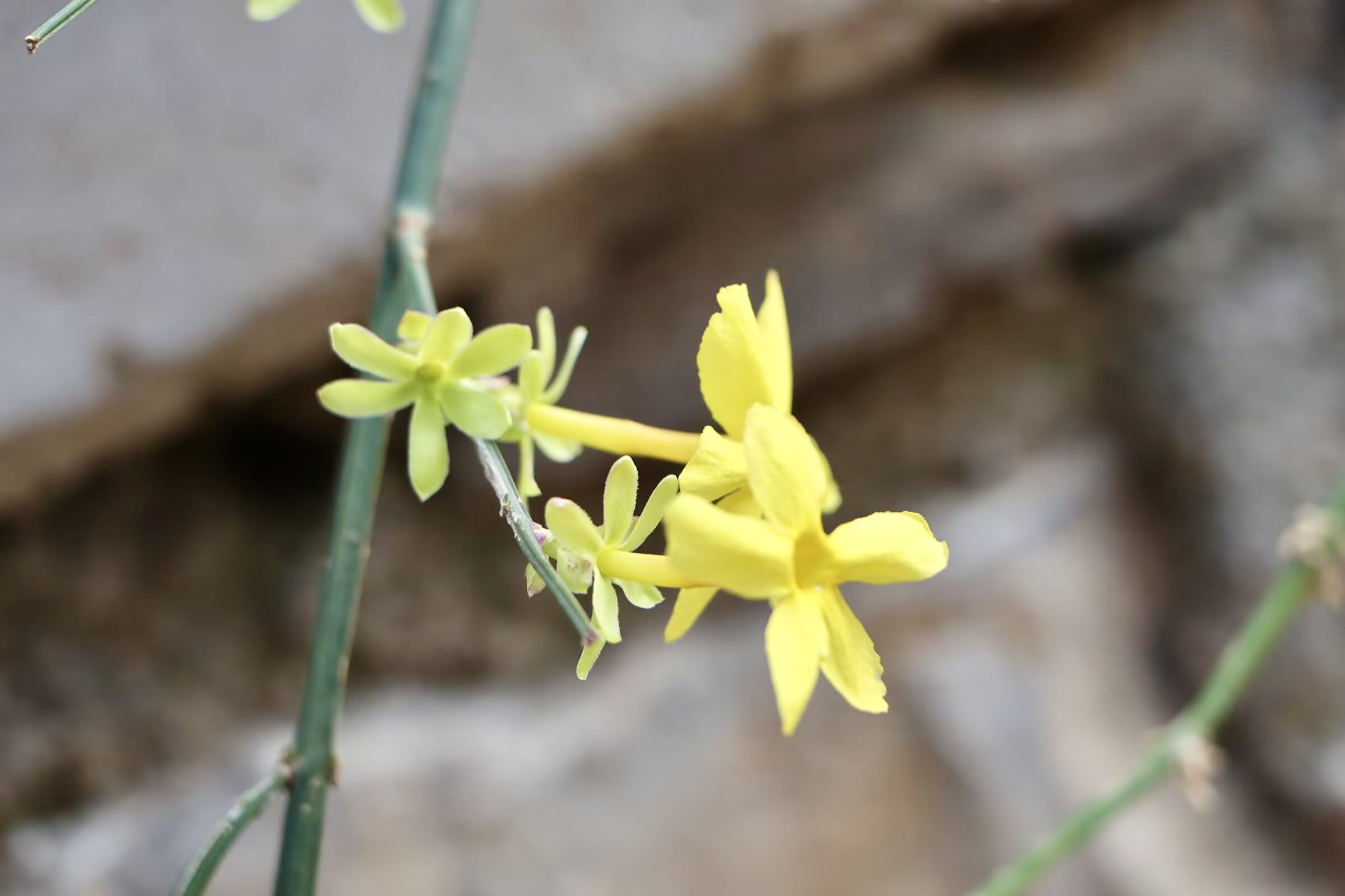 迎春花,六瓣,有长长的花柄,花瓣细长,像六只小手指轻轻张开。