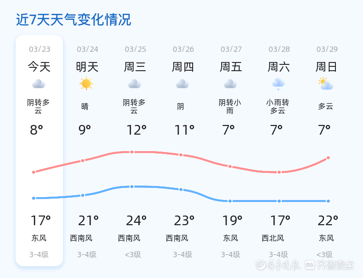 今日(3月23日,农历二月初五)德州地区天气阴转多云,气温介于8℃至17℃之间,东风2级,空气湿度较高,达80%。当前温度为10.1℃,空气质量指数(AQI)为130,属于轻度污染。全市各区天气情况基本一致,均为阴转多云,风力较小,整体天气较为平稳。