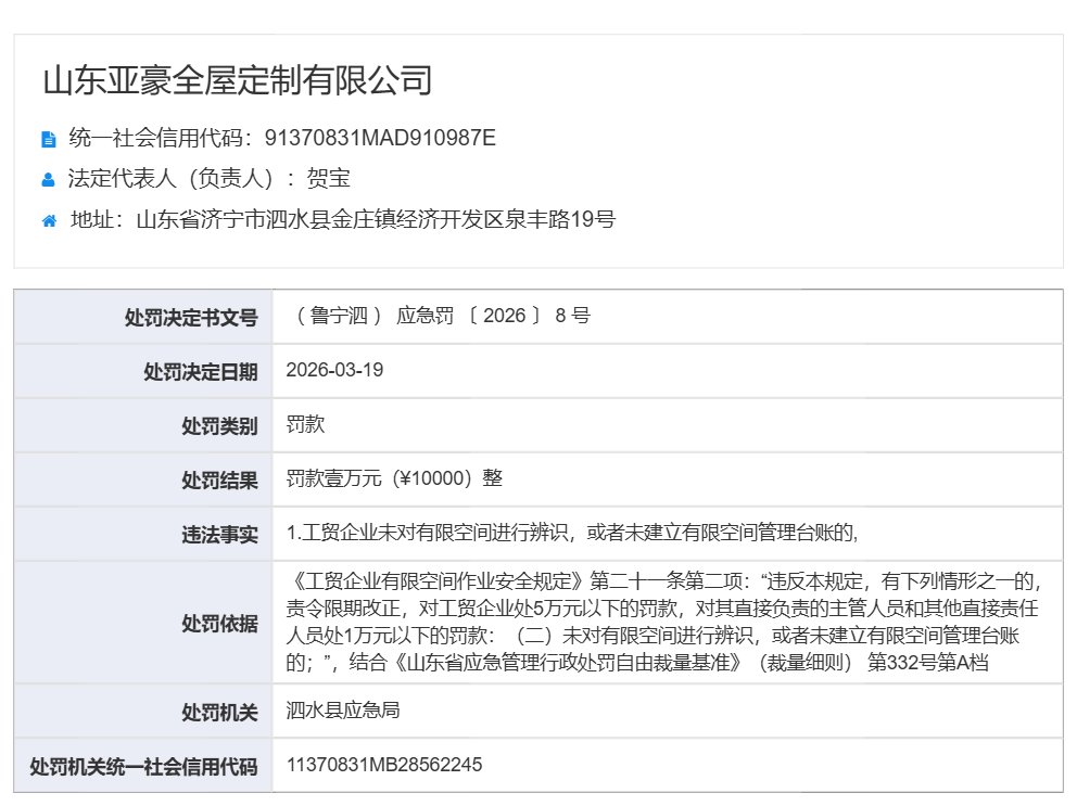 山东亚豪全屋定制有限公司被罚款10000元