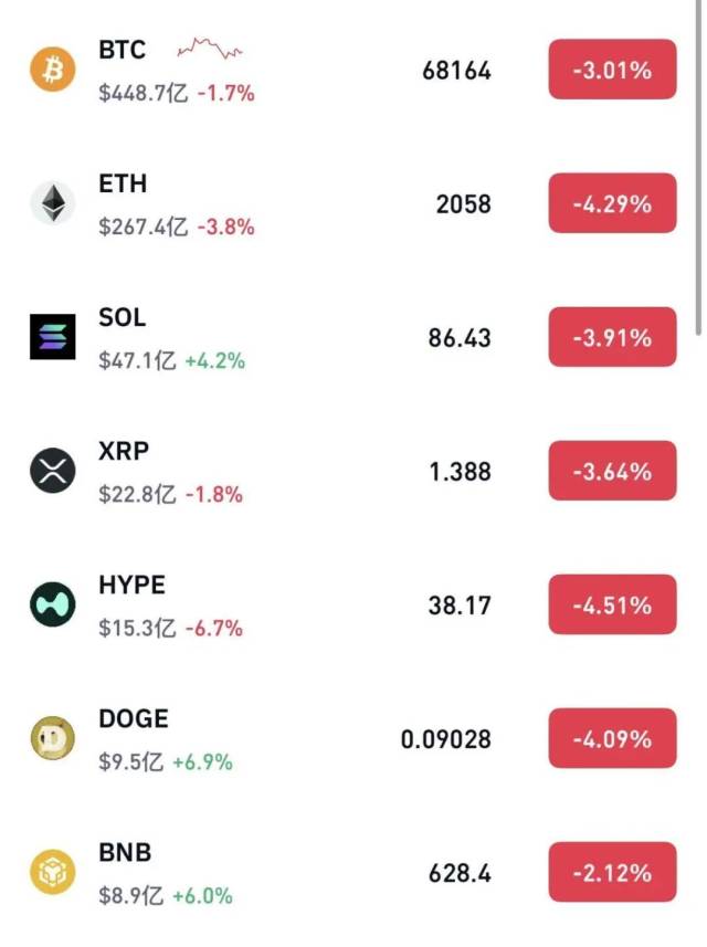 截至发稿,加密货币主要币种集体重挫,比特币跌超3%,跌至68100美元附近,以太坊跌超4%。