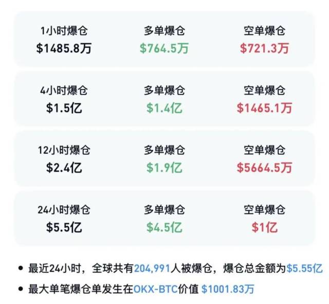 CoinGlass数据显示,最近24小时,全球有超20万人被爆仓 ,爆仓总金额为5.55亿美元。