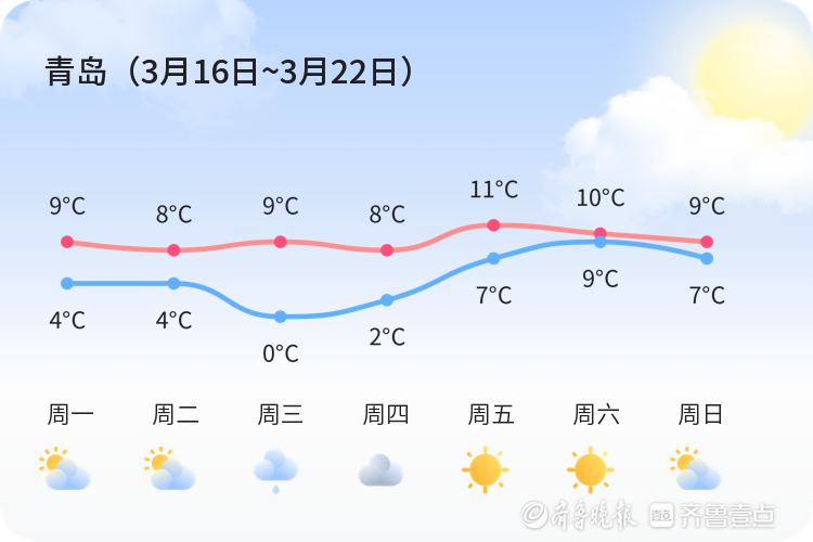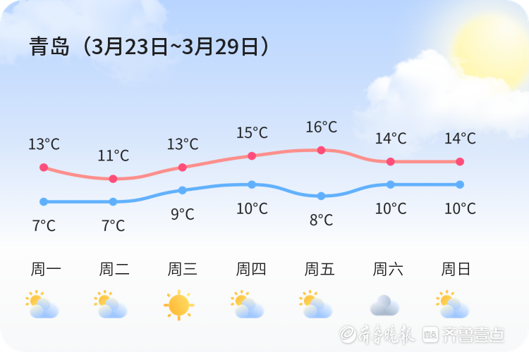 全市周平均最高温13℃,平均最低温8℃,平均气温11℃,周最高气温16℃,出现在周五,周最低温7℃,出现在周一、周二。