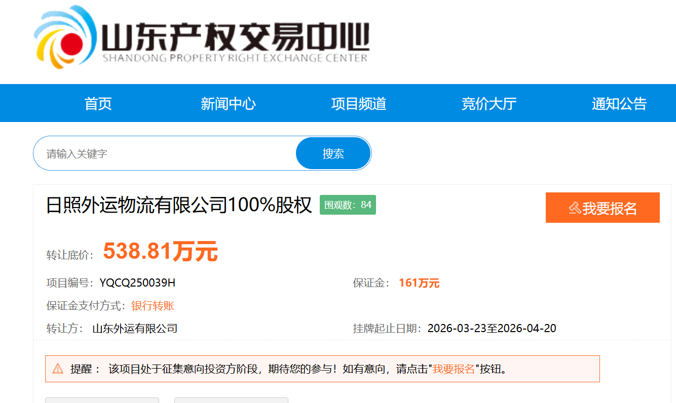 3月23日,日照外运物流有限公司(下称“日照外运物流”)100%股权在山东产权交易中心挂牌转让,转让底价538.81万元,转让方为山东外运有限公司(下称“山东外运”)。
