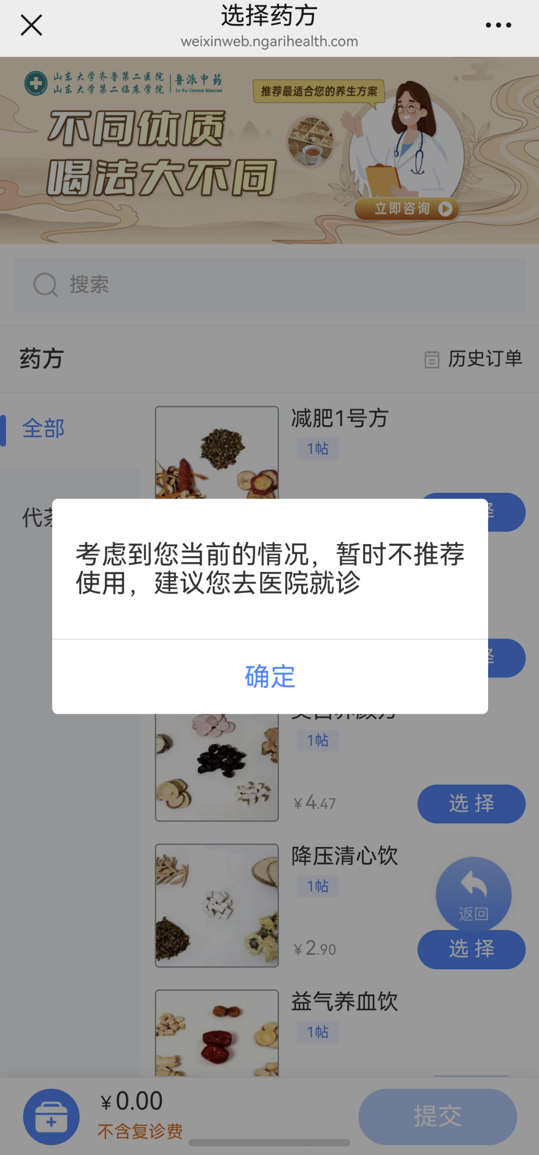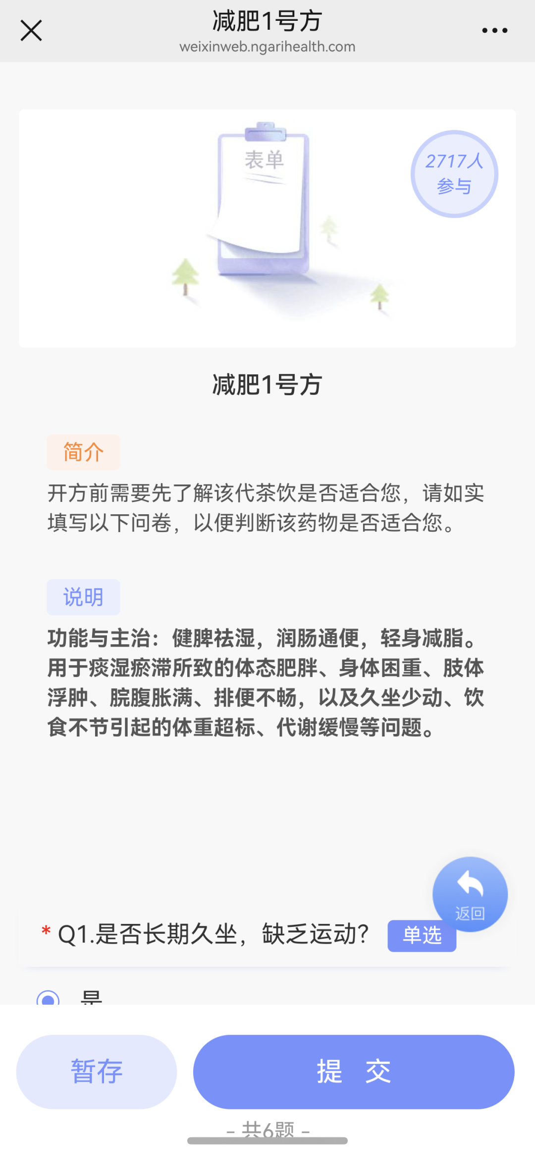第三步:选择需要的代茶饮种类进行线上辨证,完成体质问卷了解该代茶饮是否适合您饮用,如不适配则无法下单,满足体质要求方可选购相应代茶饮,如需下单多款代茶饮,需依次完成相应辨证问卷。