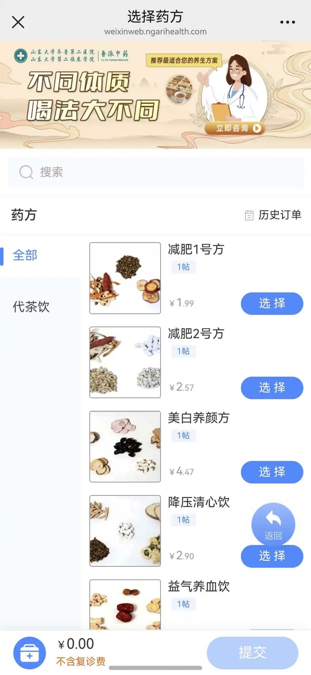 第二步:点击下方菜单栏“就诊服务”—“代茶饮开方”,进入“选择药方”页面。