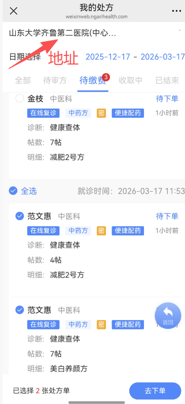 第五步:点击『查看处方』进入“药品处方”页面,完善收货地址,选择需要的处方『去下单』即可坐等享受您定制的“新中式茶饮”!