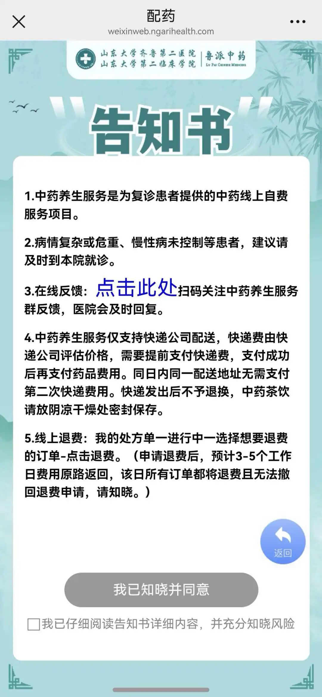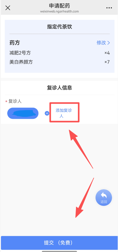 第四步:选好代茶饮规格和下单份数后『提交』,阅读告知书后进入“申请配药”页面,在“复诊人信息”处添加就诊卡,提交个人信息后,由医师开方、药师审方后形成处方。