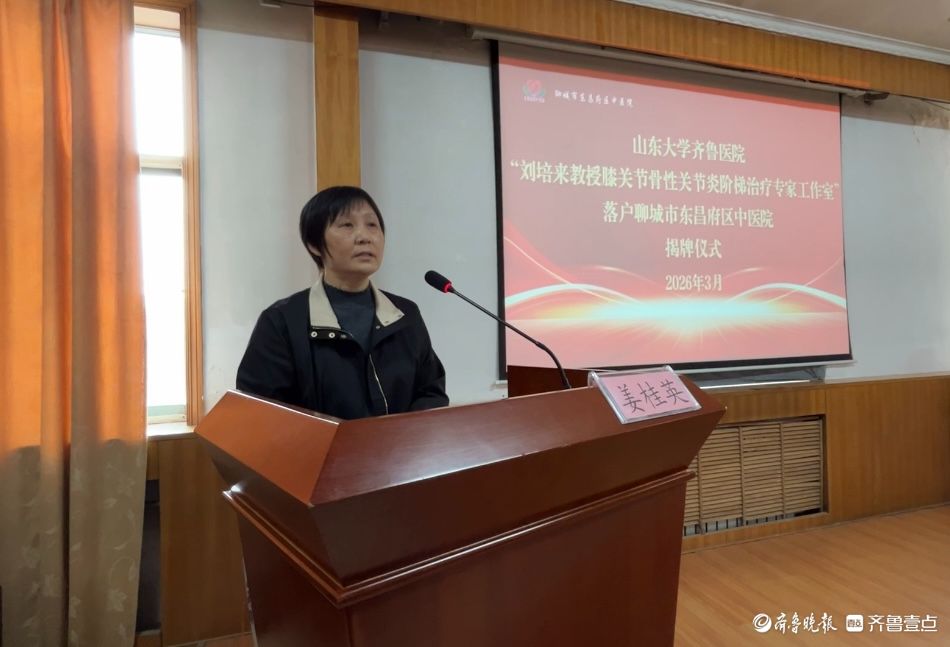 东昌府区卫健局党组成员、副局长、区中医药管理局副局长姜桂英首先发表致辞。她代表区卫健局对工作室的成立表示热烈祝贺,并向刘培来教授及齐鲁医院的支持表示衷心感谢。她指出,当前正值“十五五”开局之年,推动优质医疗资源下沉、解决群众看病就医难题是卫生健康工作的重中之重。刘培来教授工作室的落户,是落实分级诊疗、推动中医药传承创新发展的生动实践。希望区中医院以此为契机,深耕专科、育才强科,将工作室打造成技术高地、人才高地和惠民平台,让东昌百姓足不出户就能享受到省级专家的同质化诊疗服务。