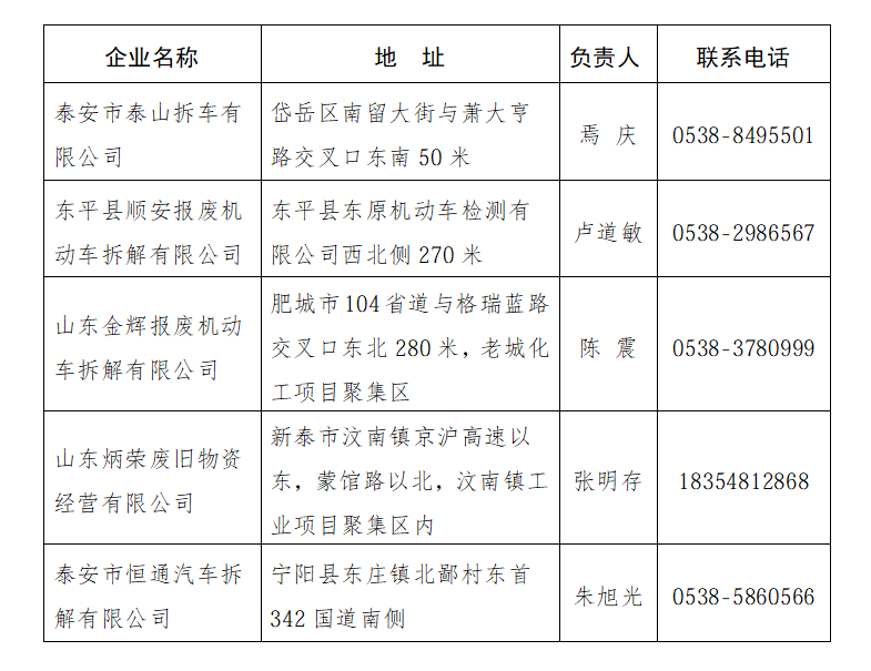 四、泰安市报废机动车回收拆解资质认定企业名单