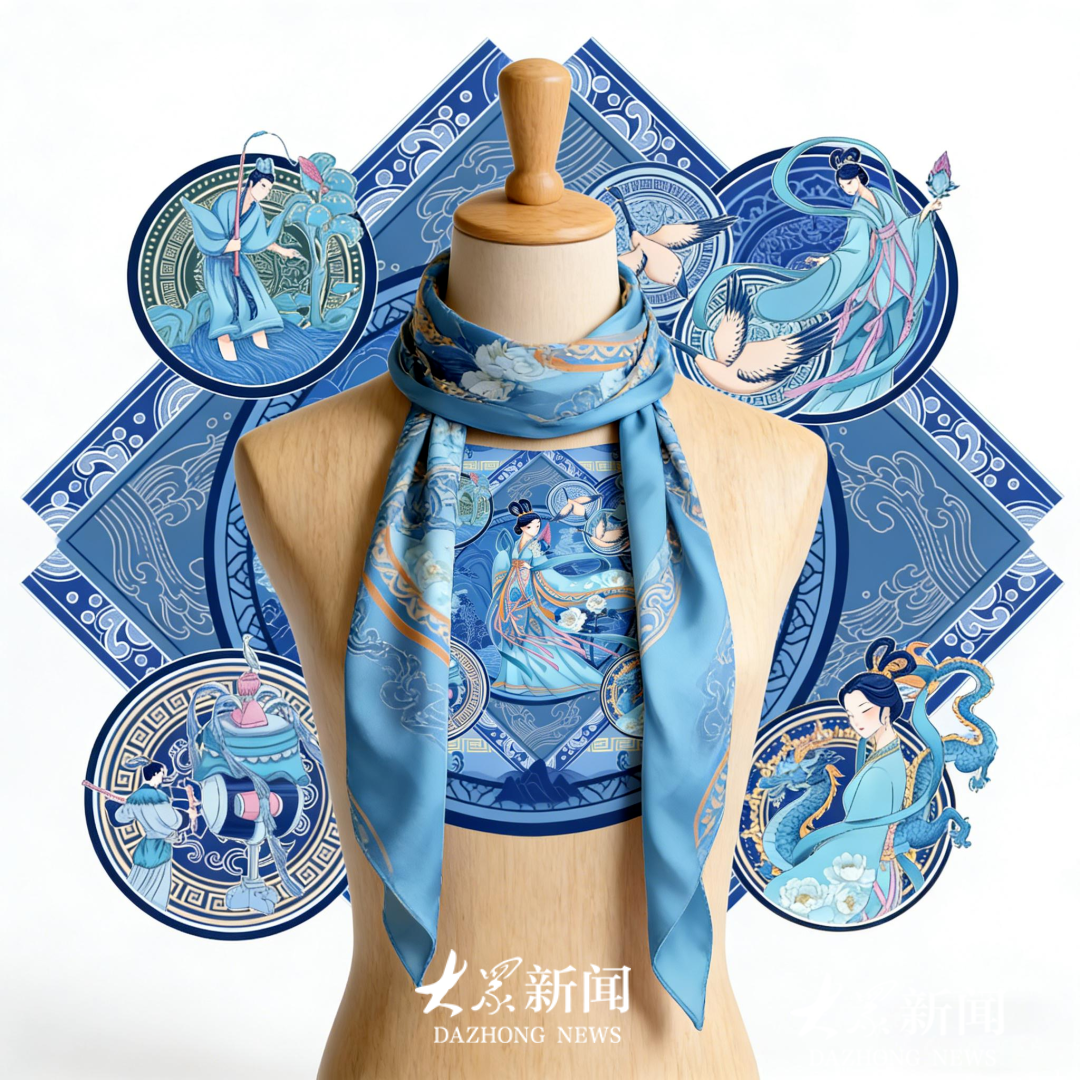 这面延续牡丹名画开发方向的文创丝巾。取意《洛神赋图》“翩若惊鸿,婉若游龙” 的初见名场面。画面以青蓝为主调,层层水纹与云浪铺陈洛水烟波,中央洛神衣袂翩跹,白牡丹缀于裙裾与鬓边,呼应“华茂春松” 的绰约风姿;四角圆窗分别绘出曹植初见、仙鹤传情、乐声引遇、龙护芳容的经典场景,将洛水河畔的惊鸿一瞥,化作可随身佩戴的诗意画卷。
