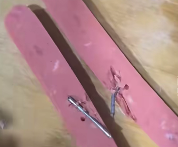 发现异样后,王先生并未直接食用,而是小心将火腿肠切开查看,结果发现两根完整的钢钉牢牢嵌在火腿肠内。
