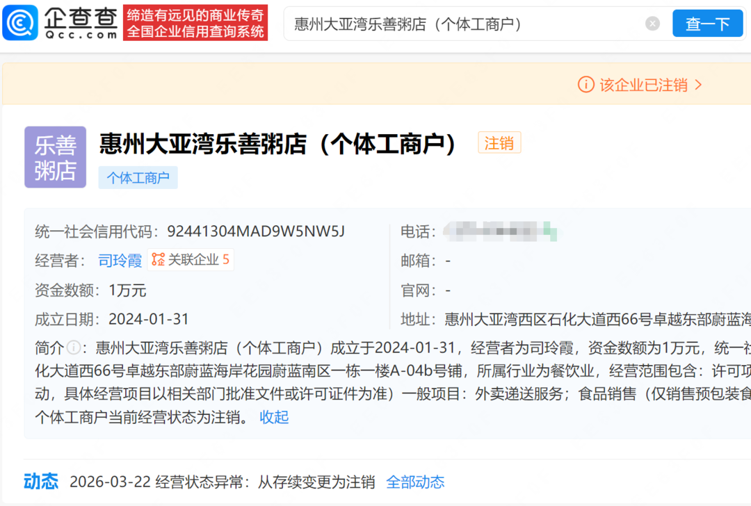 企查查App显示,近日,惠州大亚湾乐善粥店(个体工商户)发生工商变更,经营状态从存续变更为注销。该公司成立于2024年1月,经营者为黄杨钿甜的母亲司玲霞,资金数额为1万元,经营范围为餐饮服务、外卖递送服务、食品销售。