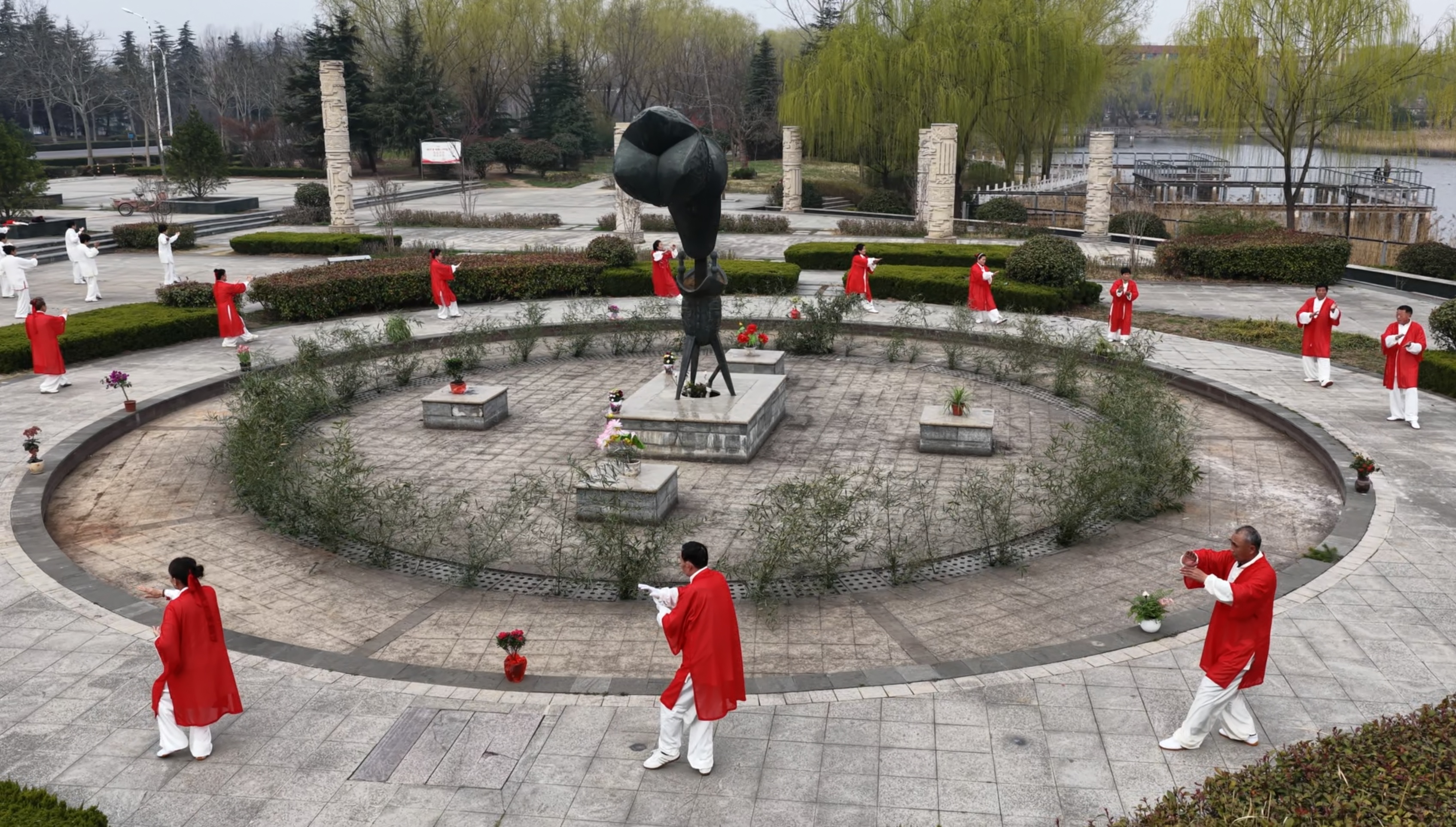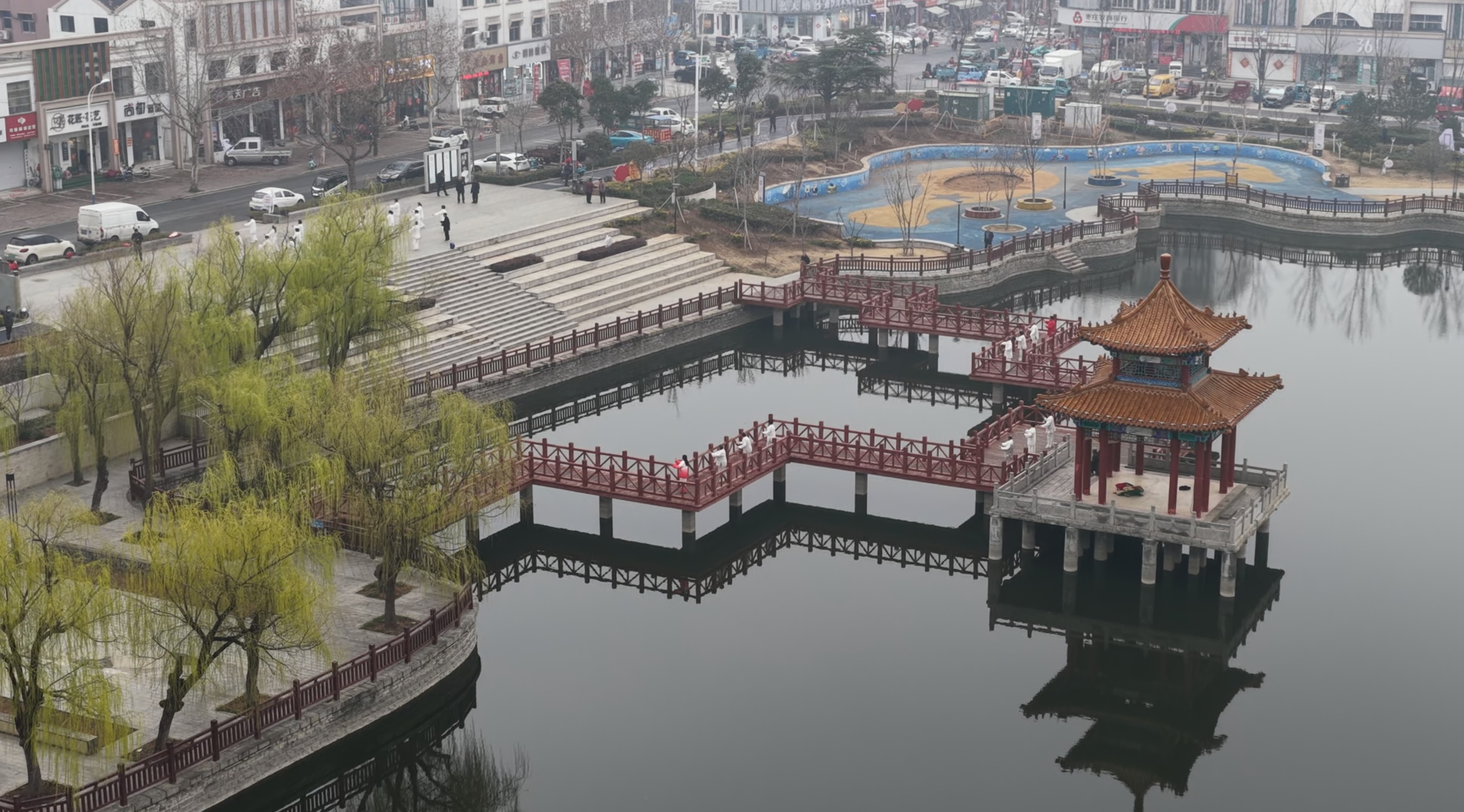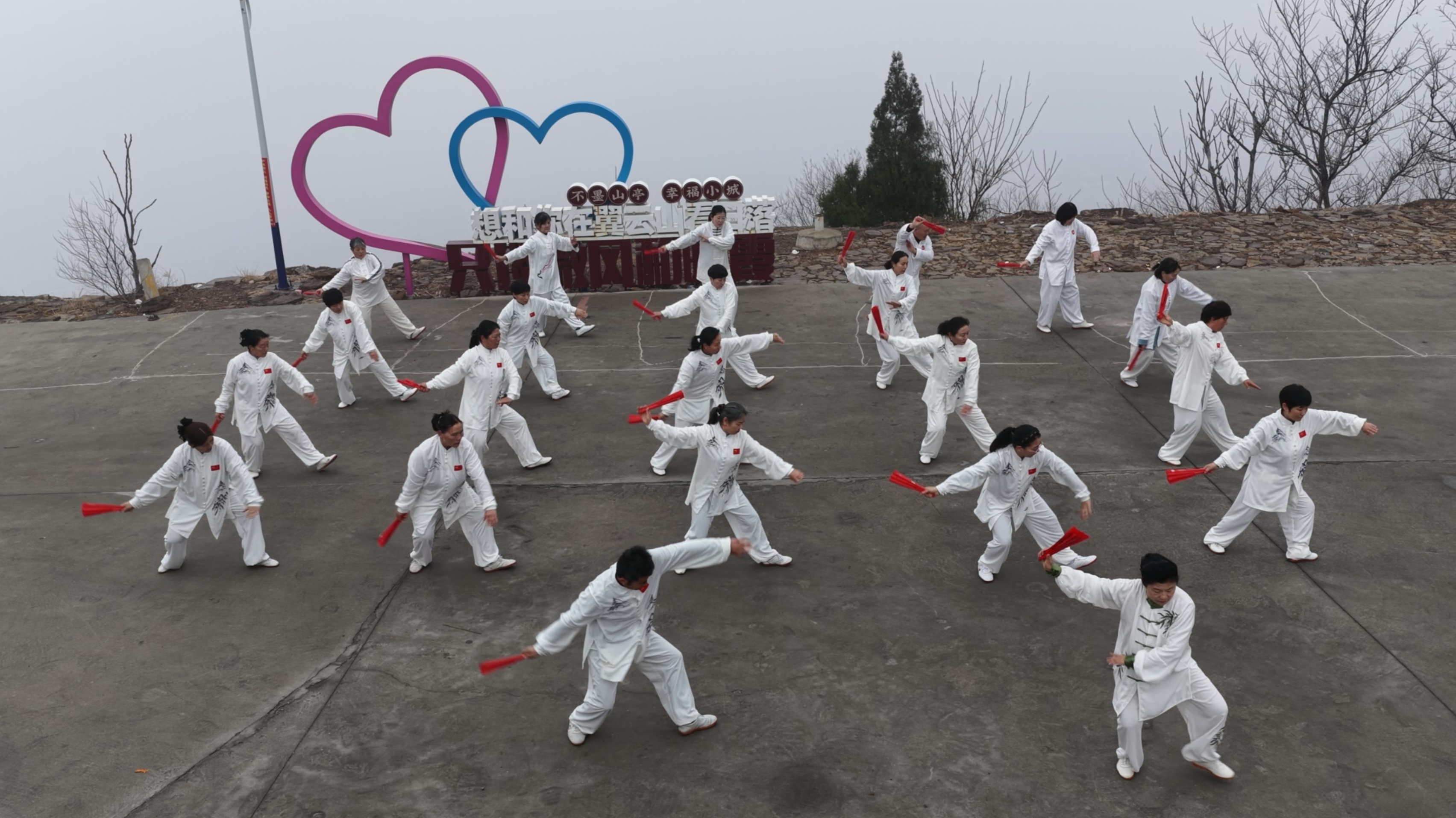 活动秉持简约安全、体旅融合原则,汇聚全区太极拳从业者与爱好者,依托翼云阁广场、翼云山等八大核心景点,打造“一景一特色、全域共精彩”的展演格局。八大景点同步上演特色太极展演:在翼云阁广场,太极与城市地标共融,彰显开放包容的城市气质;太清湖、紫云湖、丰泽湖旁,太极拳爱好者伴着湖光开展慢练体验,尽显康养之美;翼云山上,表演者在云雾中展演,演绎太极之道;石嘴子古村落里,太极与非遗技艺碰撞,实现双向赋能;月亮湾、岩马水库边,太极与湿地、湖光相融,尽显自然之美;西集龙河畔,刚柔并济的展演徐徐展开,勾勒出山水太极画卷。