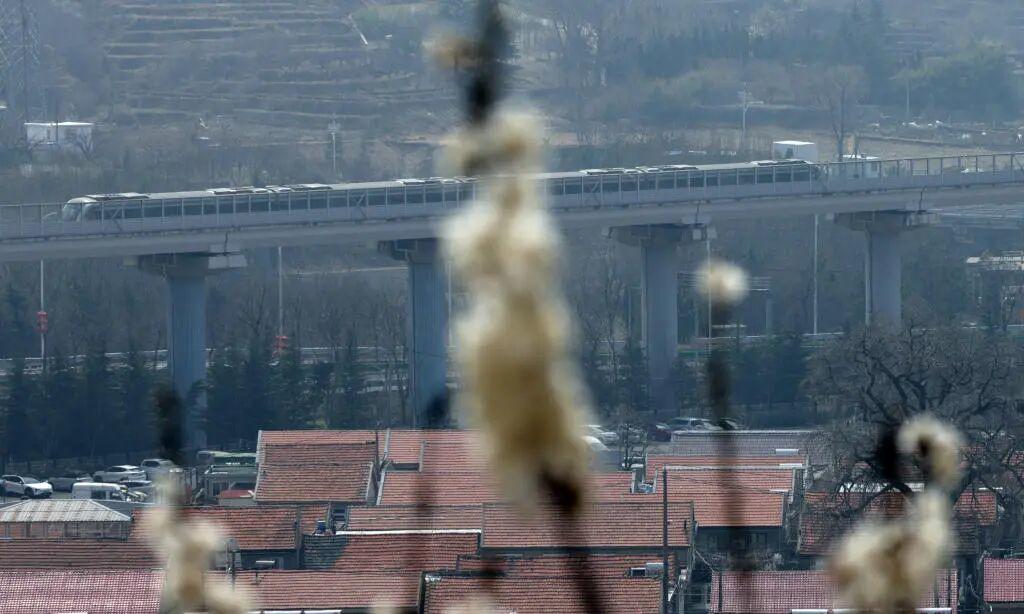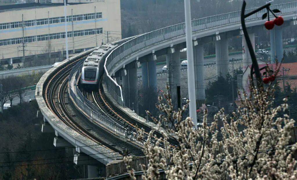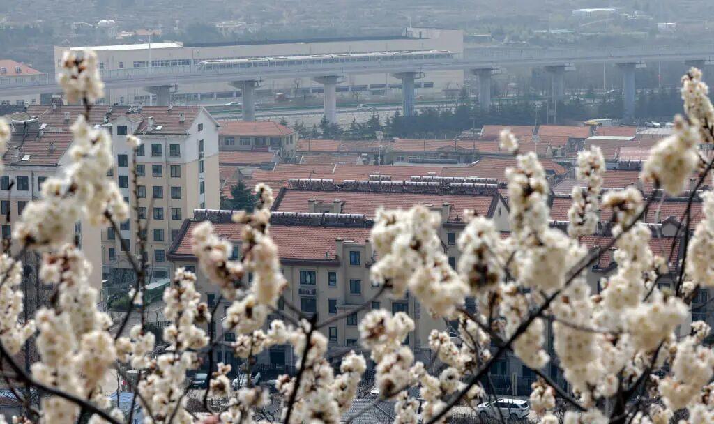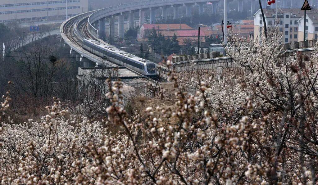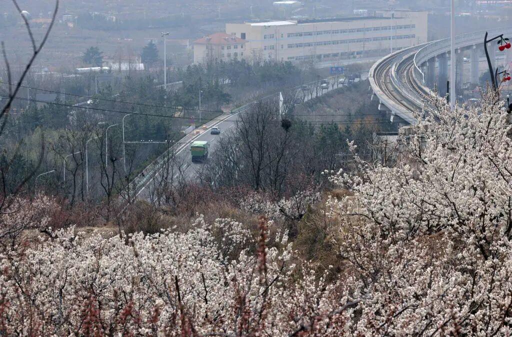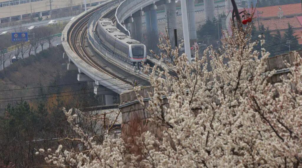 每隔约10分钟,列车便在樱桃花、杏梅花的簇拥中穿行而过,这里也被网友称作 “开往春天的地铁”。