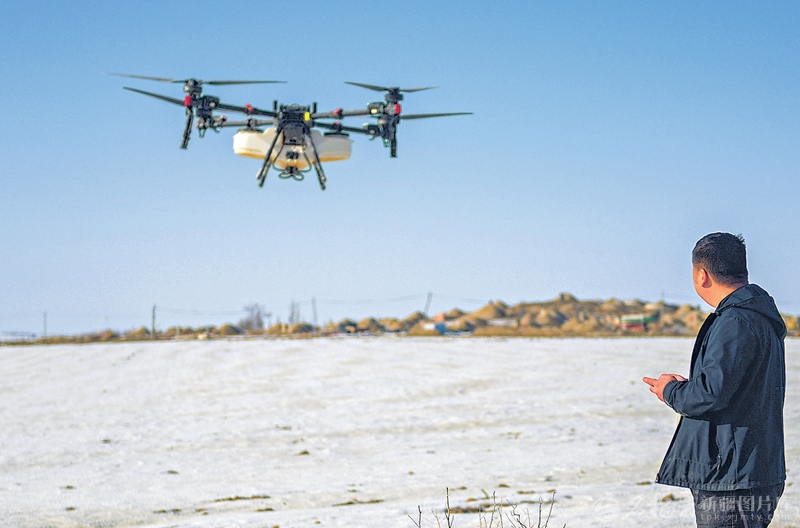 3月16日,乌苏市西湖镇西湖村村民操作植保无人机为冬小麦播撒融雪肥。眼下,乌苏市7.2万亩冬小麦陆续返青,农技人员深入田间,指导村民科学施肥,护航小麦健康生长。李仁锡摄
