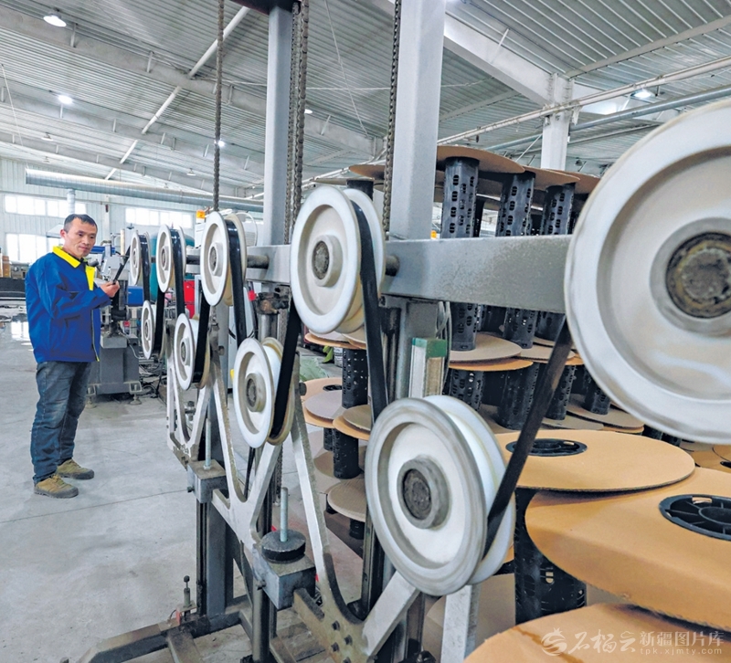 3月17日,精河县兴晟塑业有限公司工人在车间生产滴灌带。该公司正开足马力加紧生产,保障春耕。于苏甫·艾尼摄