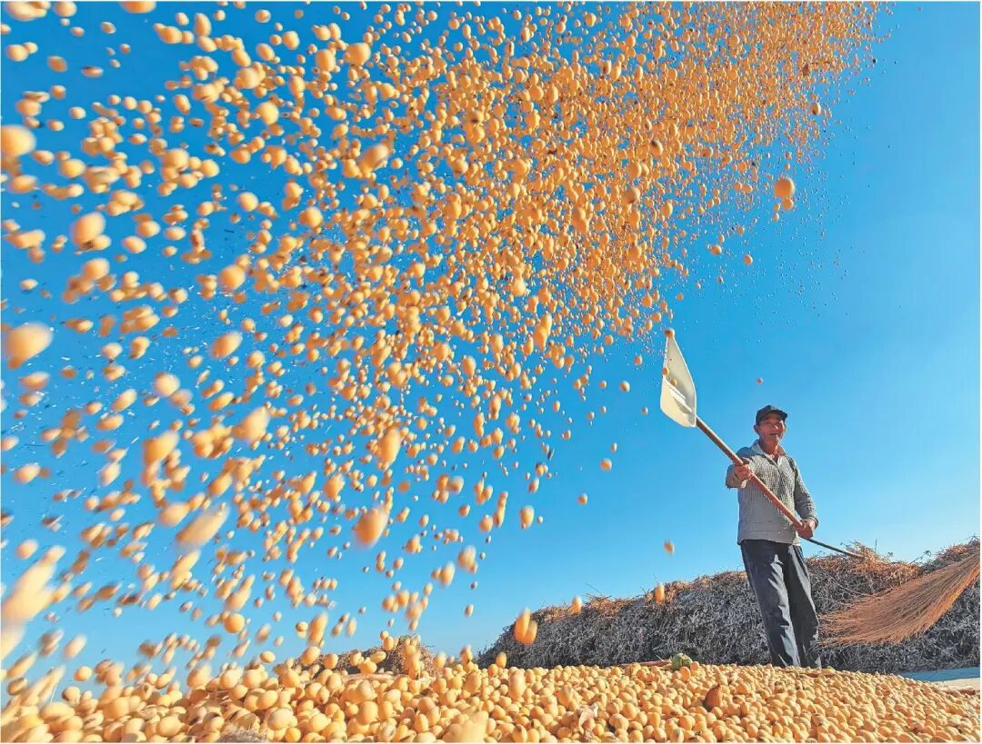 《盐碱地大豆“芯”升级》在黄三角农高区晾晒场,工作人员将收获的“齐黄34”大豆进行扬场。