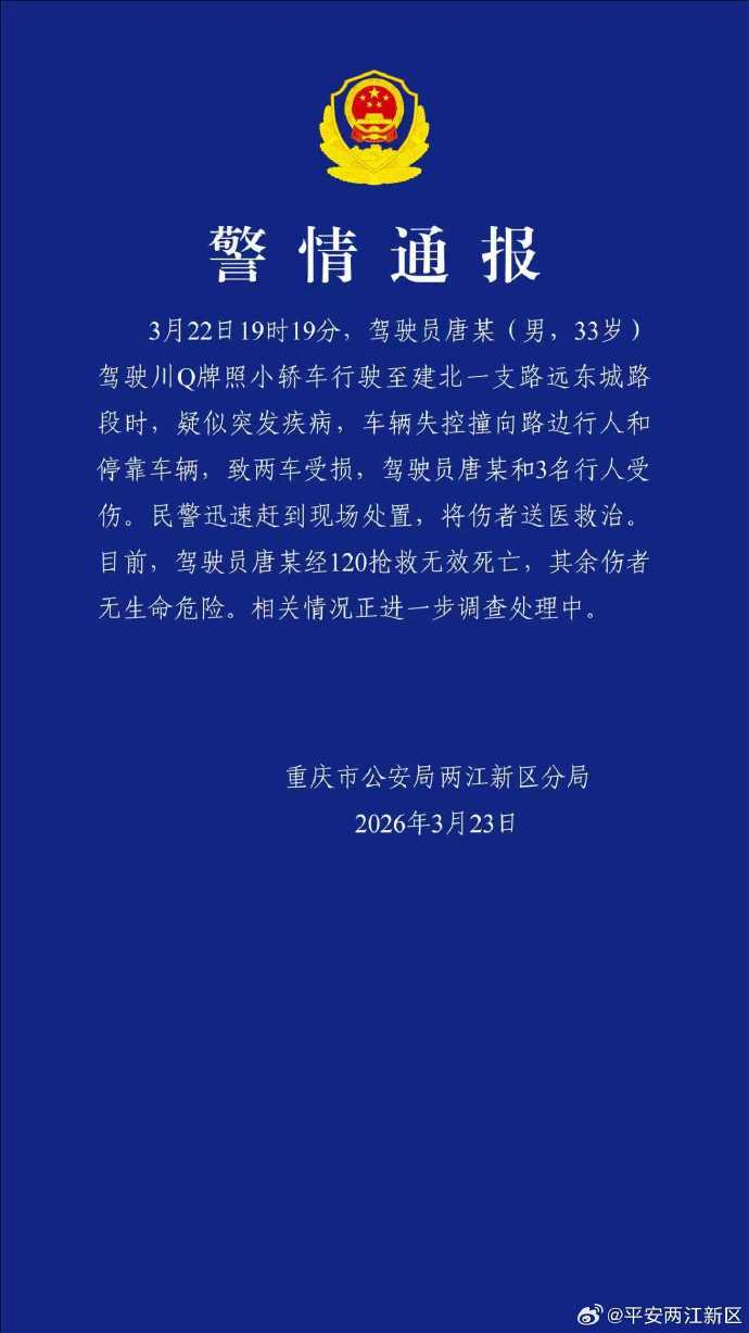 3月22日19时19分,驾驶员唐某(男,33岁)驾驶川Q牌照小轿车行驶至建北一支路远东城路段时,疑似突发疾病,车辆失控撞向路边行人和停靠车辆,致两车受损,驾驶员唐某和3名行人受伤。