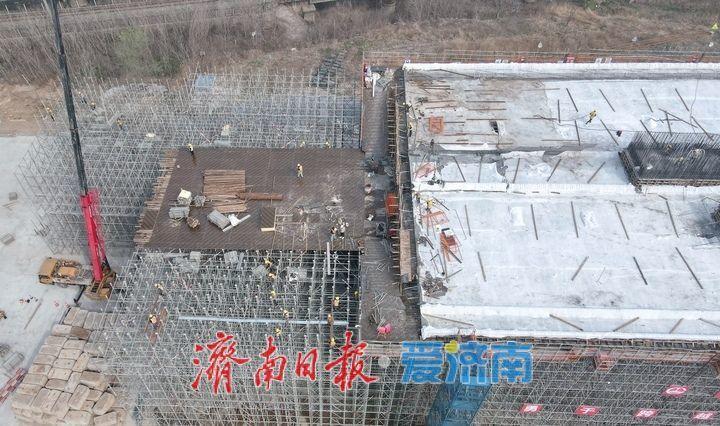 此次完成浇筑的主桥第一节段箱梁,是全线转体桥体系的核心连接构件,承担着衔接墩柱、主梁与主塔的关键作用,其施工质量与进度直接决定着项目整体推进成效。作为全线的控制性工程,涉铁段转体主桥跨度272米、重达4.3万吨,其跨度和转体重量均居省内同类型转体桥首位。据了解,腊山河西路北延工程南起德州路,北至济齐路以北,全长约1.67公里,规划为双向六车道城市主干路。项目建成后,将有效串联济南西站、国际医学中心、美里湖片区等西部核心功能区,有效分流齐鲁大道、二环西路的交通压力,进一步完善西部城区路网格局,为济南“西兴”战略实施及片区高质量发展提供强有力的交通支撑。
