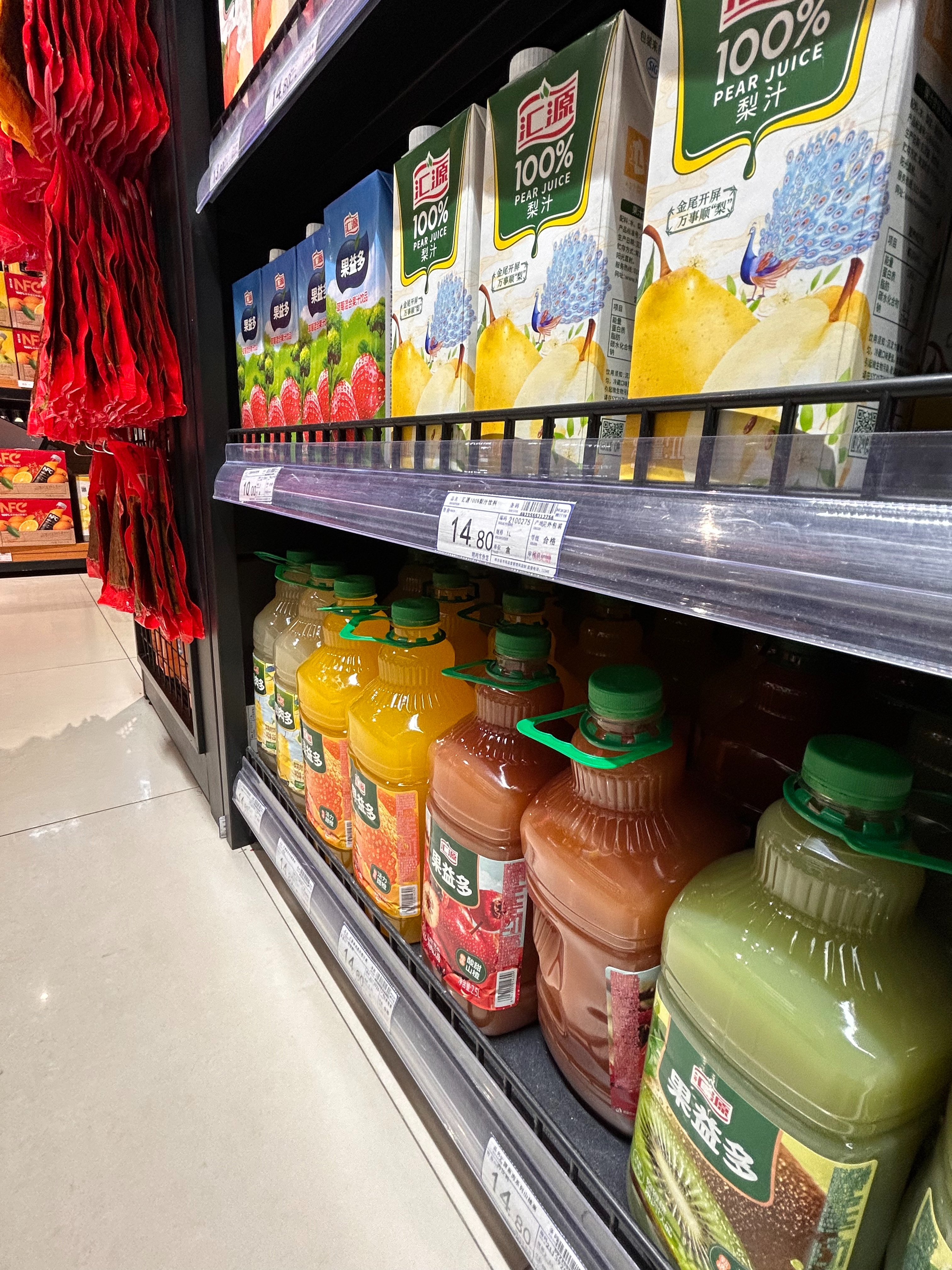 一个年轻女孩走过来,拿起一瓶冷压果汁看了看配料表,目光扫到底层那个熟悉的1升装汇源纸盒,停了一秒,又移开了。她的购物车里,没有汇源。
