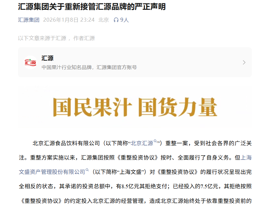 2026年1月8日,汇源集团公众号发布声明,指责文盛资产在北京汇源重整案中构成“根本违约”,宣布“全面接管”北京汇源,废除与文盛的所有合同。同时控诉文盛方控制的北京汇源私下寻找代工厂,生产“冒名顶替”的果汁,并强硬表态:非经汇源集团提供原料生产的果汁产品,不得冠以“汇源”名义销售。
