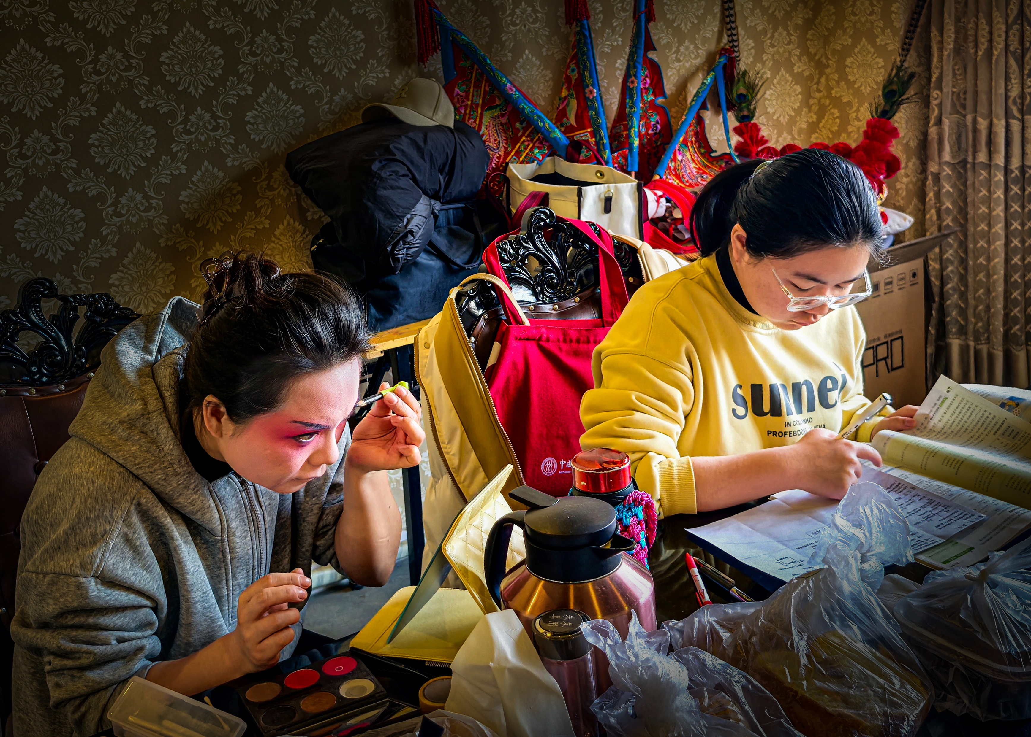 作品说明:2026年2月21日,山东省泰安市泰山秀城景区新春民俗文化节演出戏班后台,母亲在为登台的妆容精心勾勒,女儿在喧嚣的后台里静读,一妆一墨,皆是生活的诗意。这是属于她们的日常,也是最动人的画面。