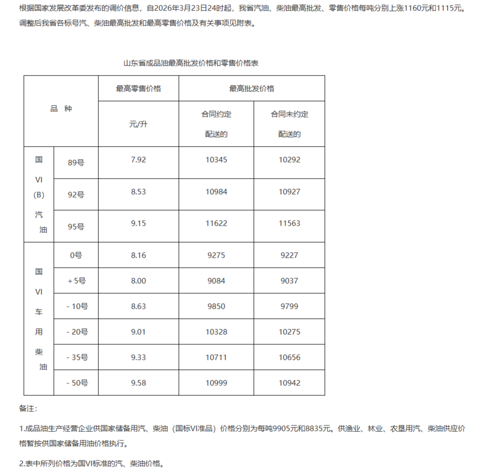 临时调控后,山东省成品油最高批发价格和零售价格表显示,92号汽油最高零售价8.53元/升,95号汽油最高零售价9.15元/升。也就是说,调控后,私家车主加满一箱50升92号汽油需多支出45元左右。