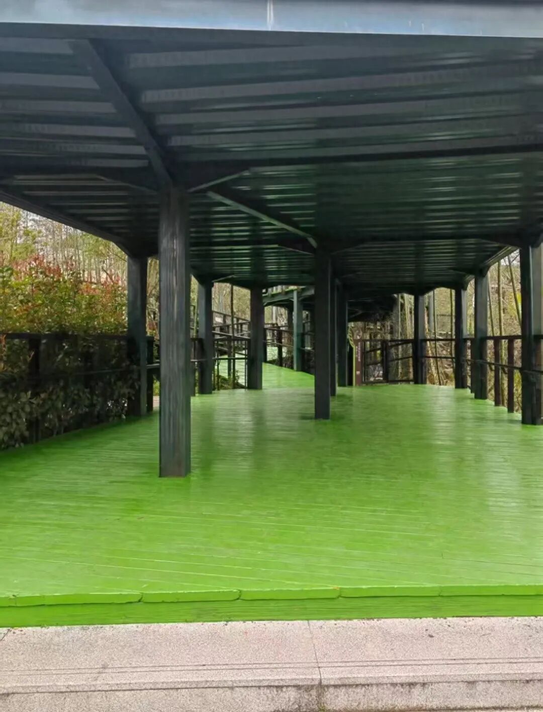 宁波野生动物园部门木桥刷绿漆。图/社交平台截图