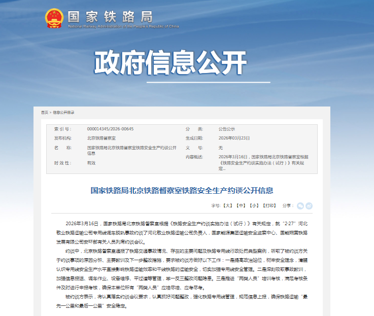 内容显示,2026年3月16日,国家铁路局北京铁路督察室根据《铁路安全生产约谈实施办法(试行)》有关规定,就“2·27”河北敬业铁路运输公司专用线调车脱轨事故约谈了河北敬业铁路运输公司负责人,国家能源集团运输安全监察中心、国能朔黄铁路发展有限公司安环部有关人员列席约谈会议。