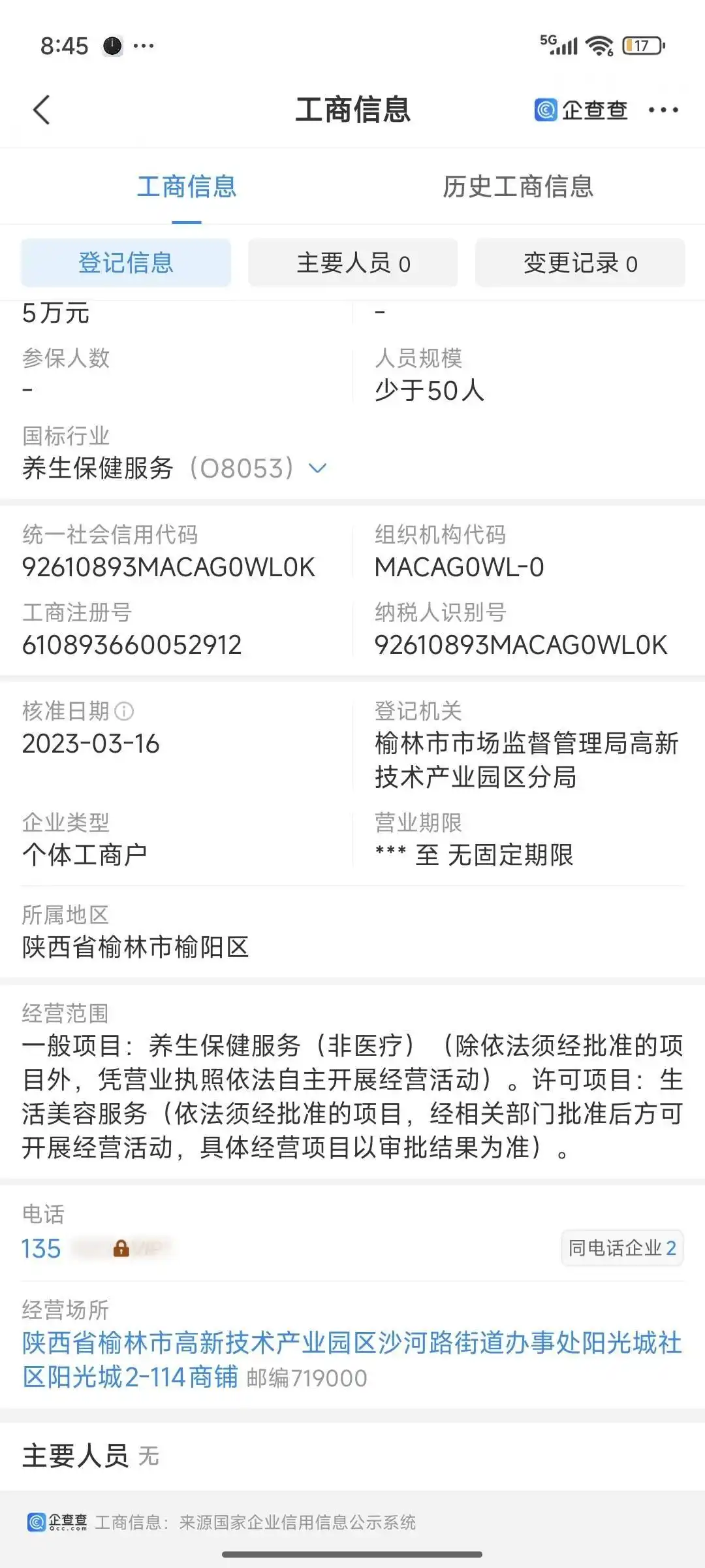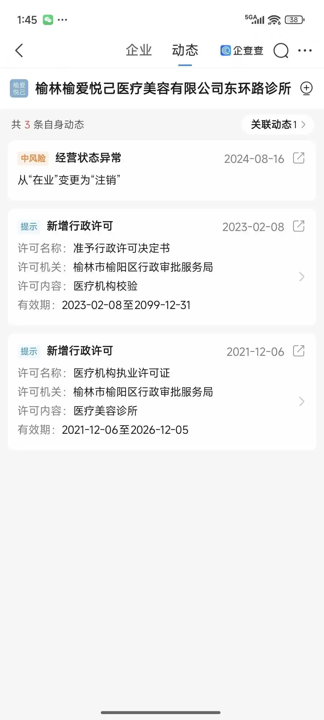 记者暗访另一家名为榆爱悦己医疗美容诊所时,工作人员表示,可以在县城一家没有工商注册信息的纹绣店进行手术。此外,尽管榆爱悦己的医疗执业许可证有效期持续至2026年12月5日,但企查查显示,该企业已于2024年8月16日注销。