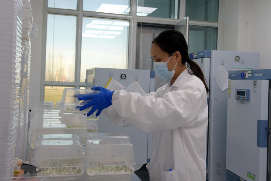 지난해 11월 14일 간쑤(甘肅)성 주취안신(酒泉芯)농업연구종자산업테크회사 바이오기술 육종실에서 조직 배양 실험 중인 연구원. (사진/신화통신)