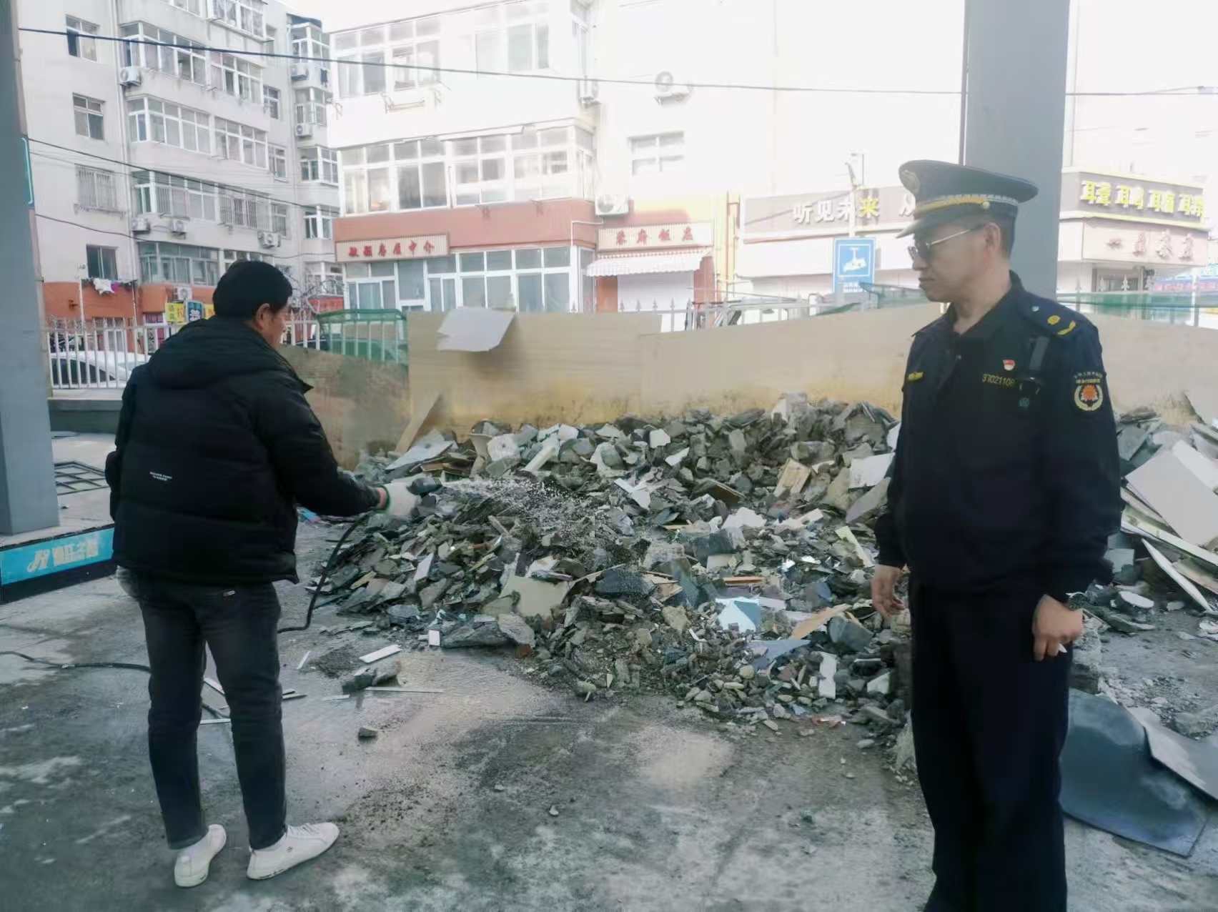 近日,青岛市市北区兴隆路街道综合行政执法中队接到群众举报,温州路某处存在装修垃圾扬尘扰民问题。执法人员第一时间赶赴现场核查处置,高效解决群众诉求。