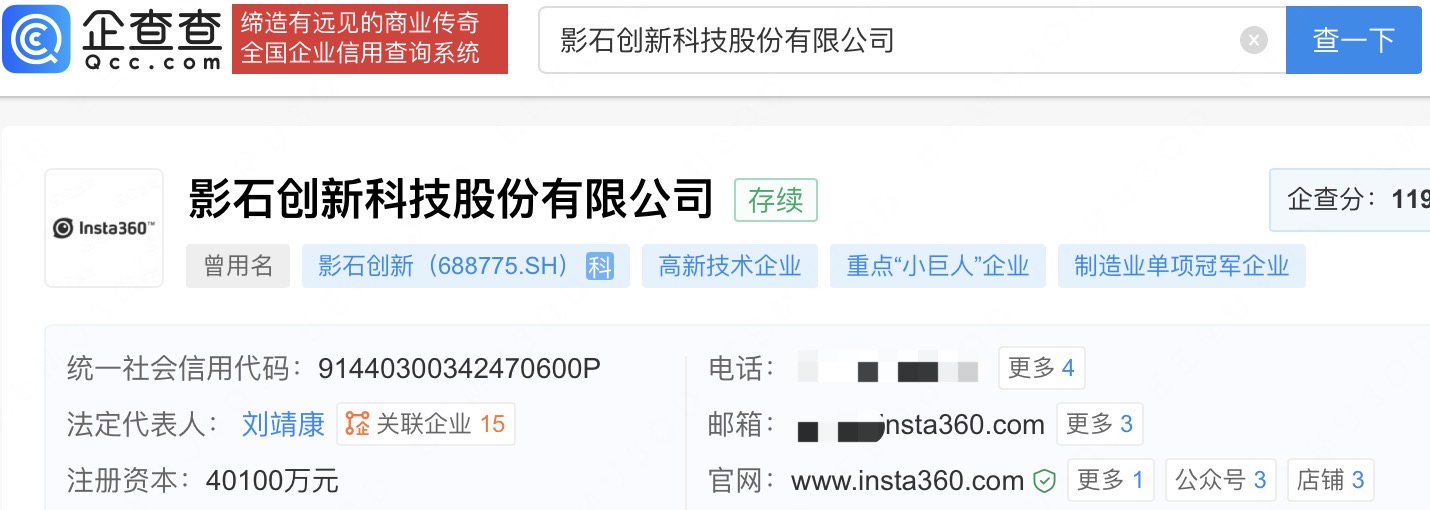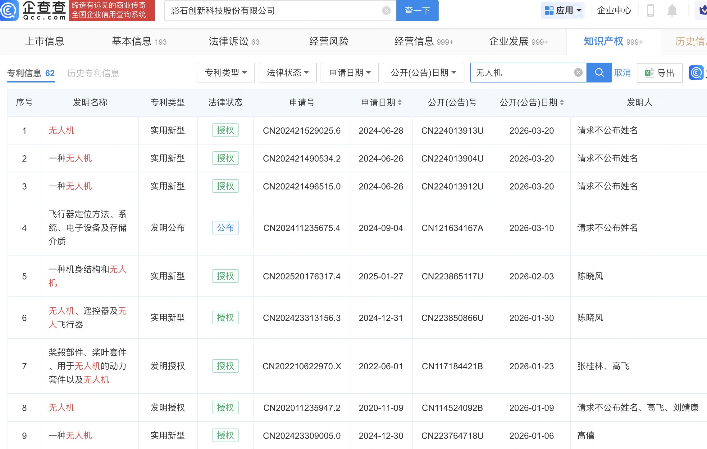 企查查APP显示,影石创新关联公司影石创新科技股份有限公司成立于2015年,法定代表人为刘靖康,经营范围含网络技术研发,计算机软硬件的技术开发、销售,经营进出口业务等。知识产权信息显示,该公司多项无人机相关专利已获授权,包括“无人机、遥控器及无人飞行器”“一种机身结构和无人机”等,其中,部分专利发明人被记载为“请求不公布姓名”。