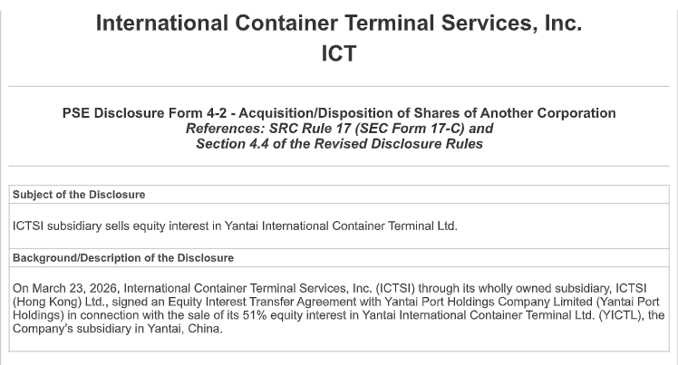 菲律宾国际集装箱码头服务公司(ICTSI)3月23日在菲律宾证券交易所公告称,ICTSI通过其全资子公司与烟台港股份有限公司签署了一份股权转让协议,拟出售其在烟台国际集装箱码头有限公司(下称“烟台国际集装箱码头”)51%股权,总交易对价7.73亿元。