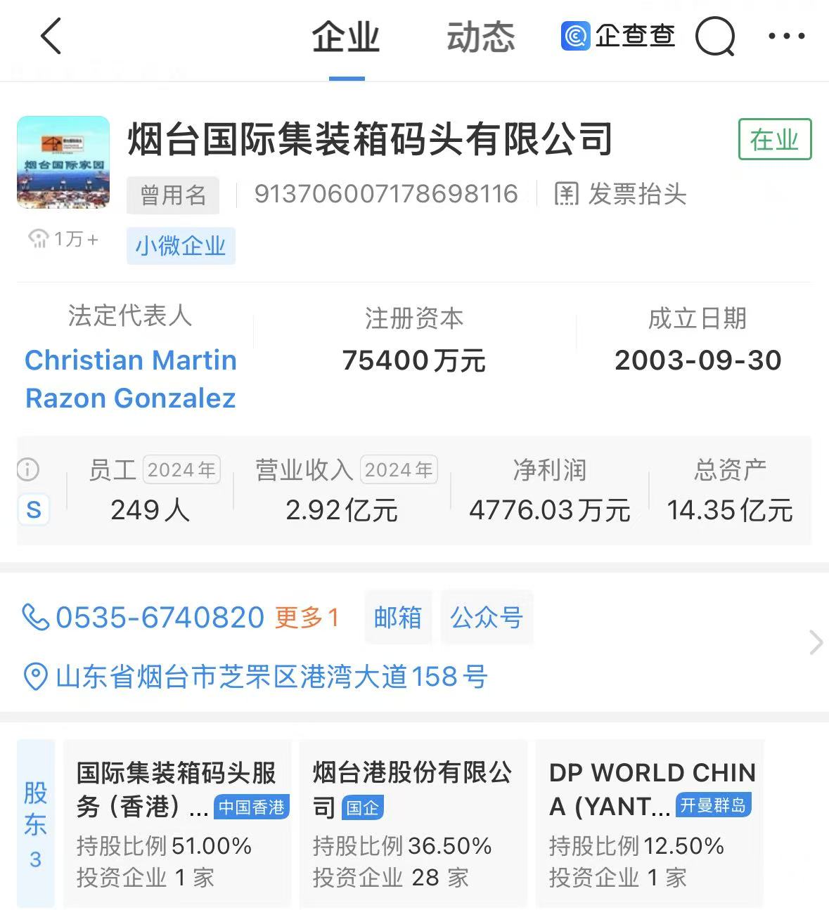 公开信息显示,烟台国际集装箱码头成立于2003年9月,为一家合资企业,由ICTSI香港有限公司持股51%,烟台港股份有限公司持股36.5%,迪拜环球港务中国(烟台)有限公司(下称“迪拜环球港务”)持股12.5%。
