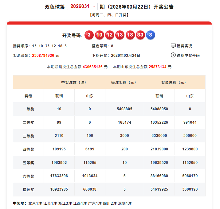 3月22日,双色球第2026031期开奖,当期销售4.30亿元,筹集公益金1.55亿元;中出一等奖10注,单注奖金540.88万元;一等奖花落七地,北京、江苏、江西、广东、深圳各1注,四川2注、浙江3注,有机选号码、也有自选号码,有单式投注,也有复式投注;中出二等奖99注,单注奖金16.51万元;中出“福运奖”1092.39万注,奖金合计5461多万元。其中,山东中出“福运奖”66万注。恭喜邂逅好运的彩友们,好运要接得住,还要拿得稳,请务必记得及时兑奖,别让这份喜从天降的幸运溜走哦。