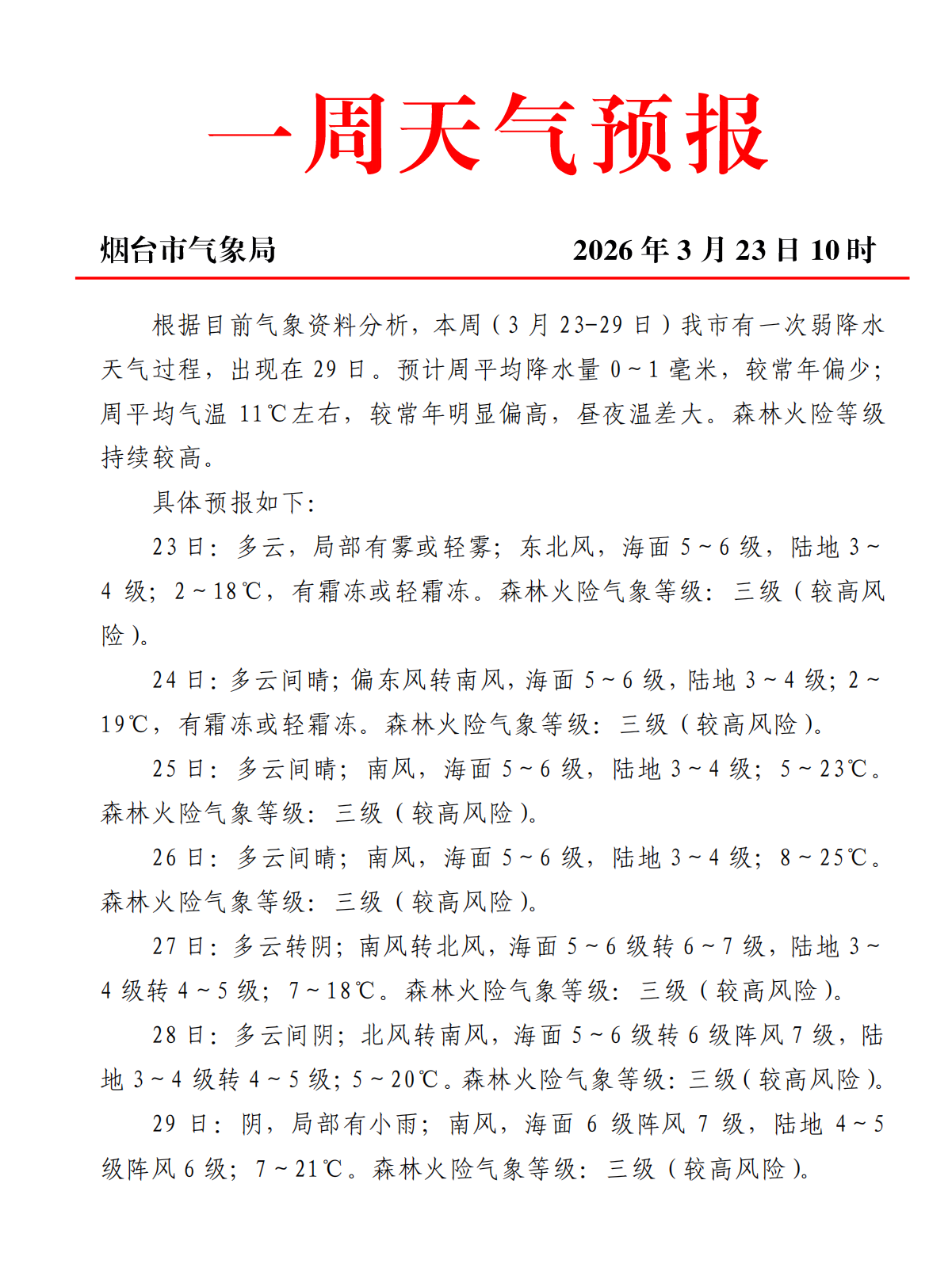 3月23日,烟台市气象局发布最新一周天气预报。根据目前气象资料分析,本周(3月23—29日)烟台市有一次弱降水天气过程,出现在29日。预计周平均降水量0~1毫米,较常年偏少;周平均气温11℃左右,较常年明显偏高,昼夜温差大。森林火险等级持续较高。