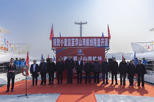 青岛市人大常委会副主任张建刚、青岛海事局副局长尹磊为“青岛小麦岛海上交通旅游有限公司”揭牌。随后,张建刚副主任宣布“青岛小麦岛浮山湾航线开通”,嘉宾和部分游客市民登船,开启首航体验。