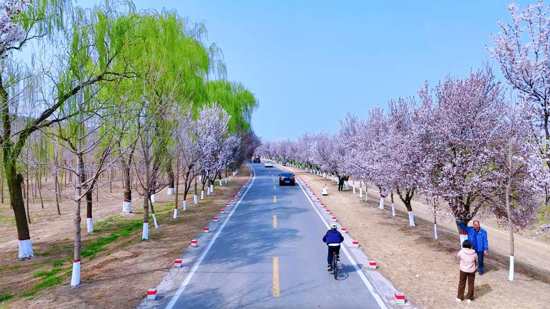 景点位置建议导航至“槐荫区美里北路黄河银杏林”附近,自驾或骑行皆宜,堤顶道路平坦开阔,沿堤顶一路前行,春色尽收眼底。