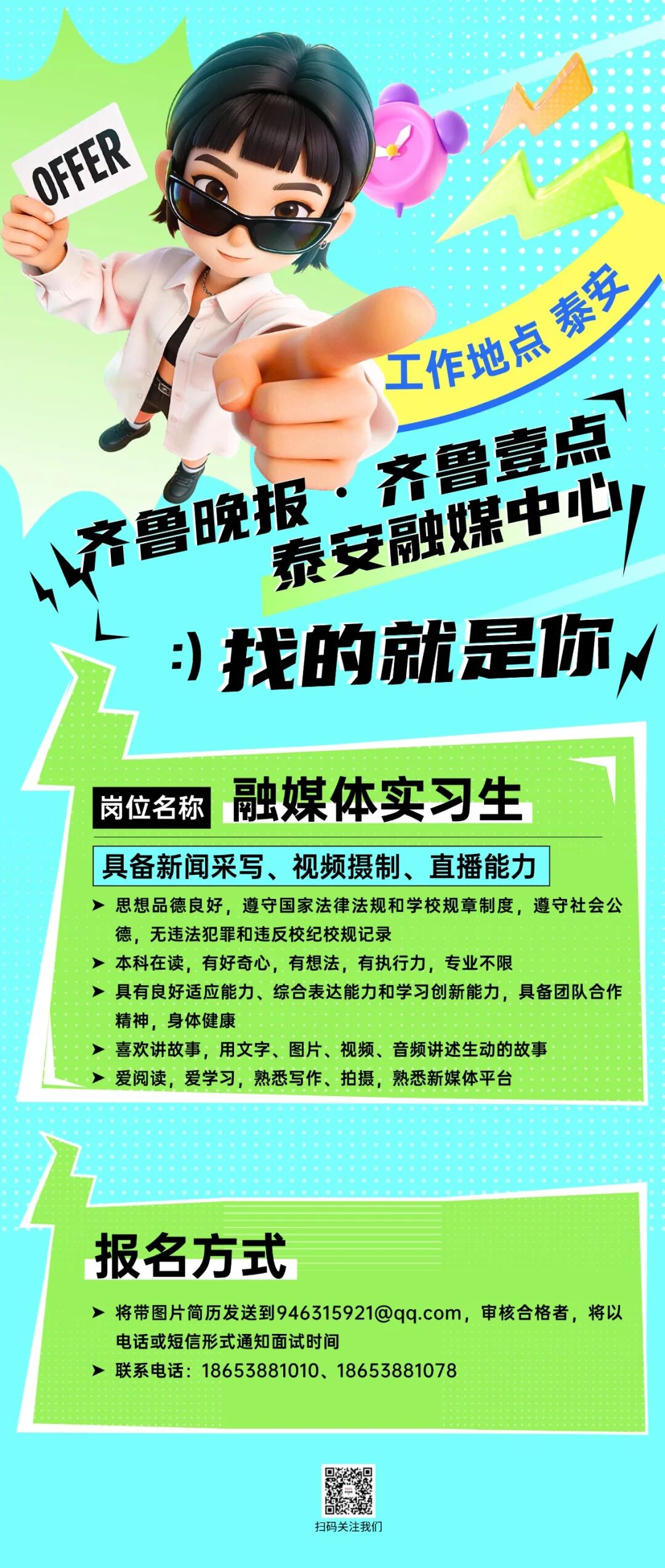大学生必看!省级媒体实习机会来了大众报业·齐鲁壹点 2026-03-23 16:49:03(齐鲁晚报·齐鲁壹点客户端欢迎各界投稿,提供线索,包括文字、照片、短视频。泰安新闻素材请联系齐鲁晚报泰安融媒中心,热线电话:0538-6982110。)责任编辑:赵晴