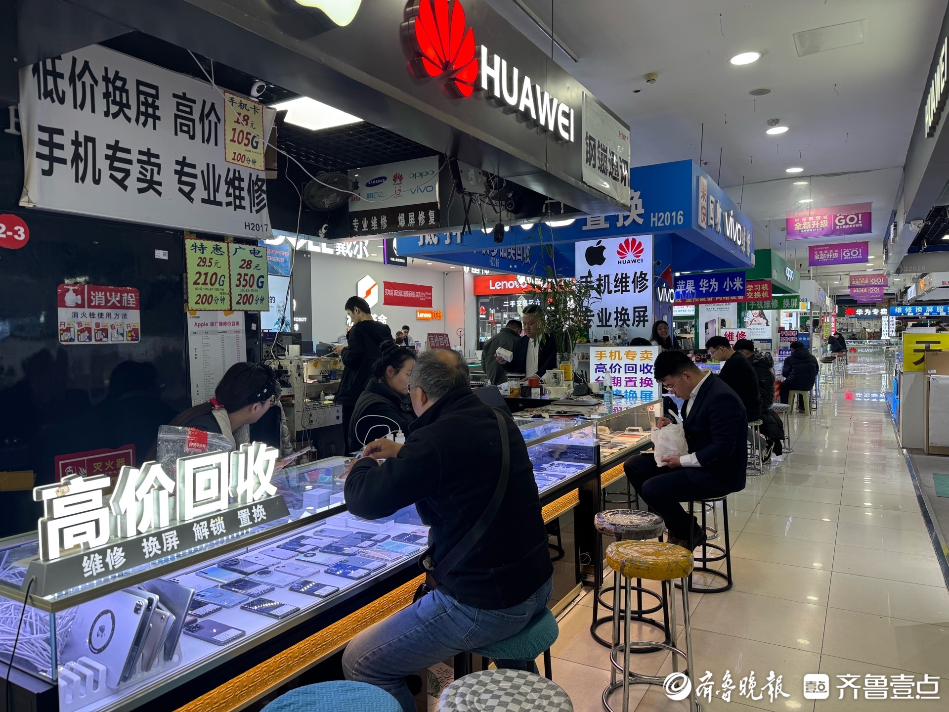3月23日,在济南华强电子世界内,不少柜台都张贴着“高价回收旧手机”“以旧换新”等广告牌或海报,十分显眼。在一家二手手机回收柜台前,记者看到,柜台上堆满了各类废旧手机,有的屏幕和后盖已经摔碎。不少消费者正在柜台前询价,老板和店员则忙着验货、报价、登记。